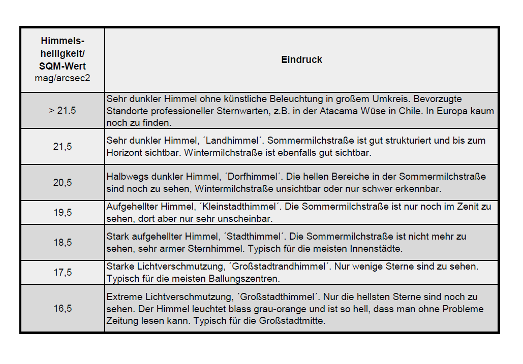 Die Himmelshelligkeit und damit der SQM-Wert wird in mag/arcsec2 angegeben. SQM-Werte kleiner 17 sind schlechte Werte, wie sie direkt in der Nähe von Straßenlaternen oder in großen Städten zu Stande kommen.